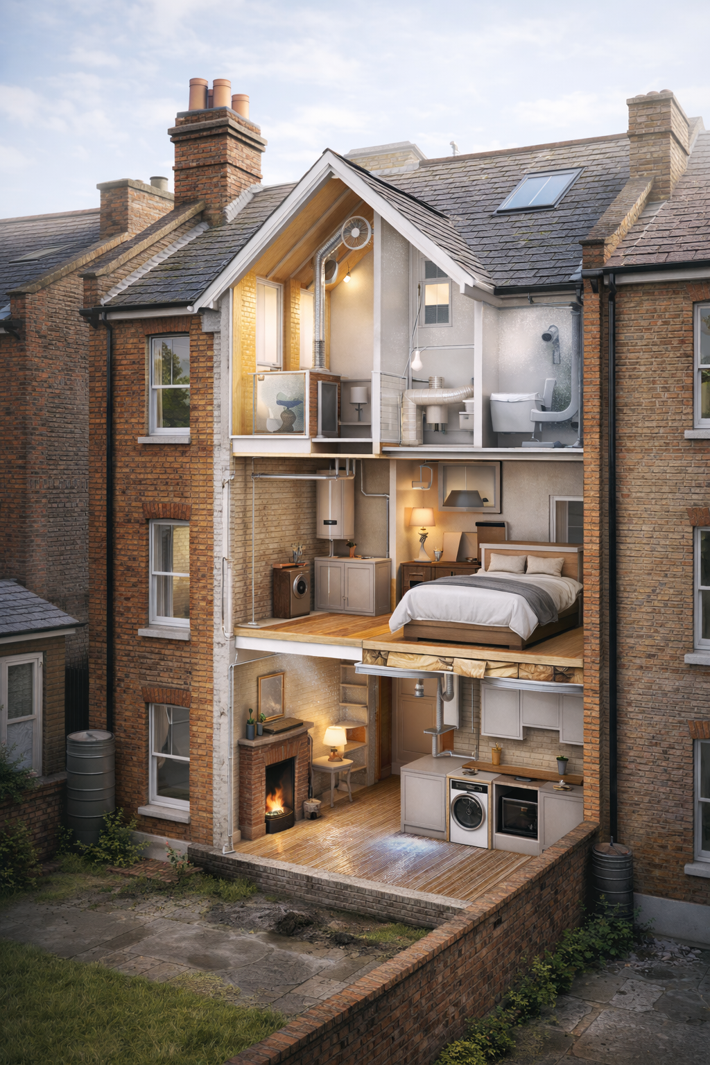 • Identification of key issues such as damp, heat loss, or poor ventilation